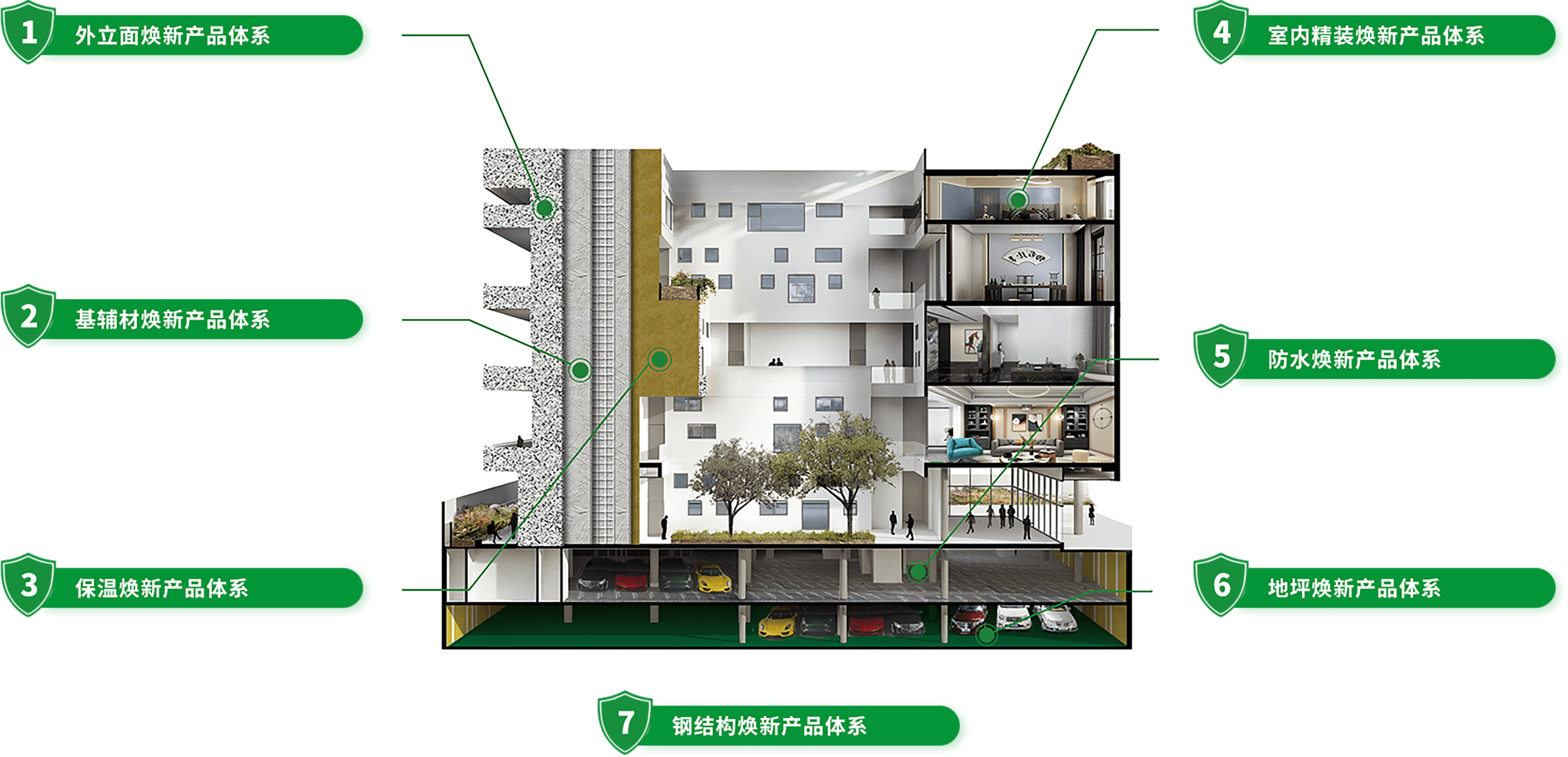 基於三棵樹工程“七位一體”産品體系構建瞭(le)綠色、節能、低碳的城市煥新渠道産品體系,並(bìng)持續升級,滿足日益增長的行業環保需求與可持續發展目标。